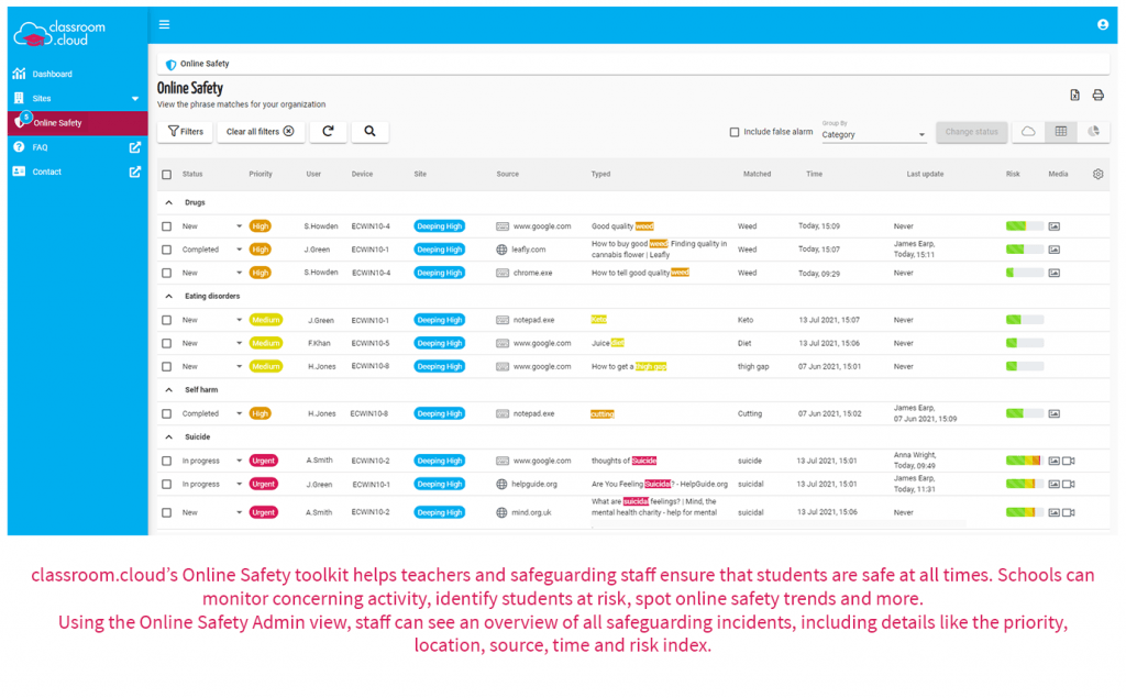 In addition, schools can ensure that their students are safe at all times (and in any location) with the online safety toolkit. This helps to keep the school’s online environment protected by monitoring concerning activity, identifying students at risk, and spotting online safety trends – even in Microsoft Teams. Its range of proactive and reactive tools include multi-language keyword and phrase monitoring, word cloud of trending topics, contextual intelligence-based Risk Index, and more.