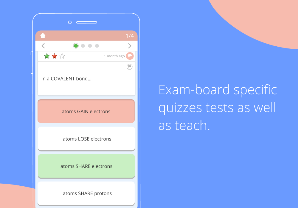 Tassomai’s multiple choice micro-quizzes reinforce knowledge through targeted repetition, like flashcards. At the same time the algorithm is learning each student’s strengths and weaknesses; it uses this information to target the gaps in a student’s knowledge and provide feedback to teachers on which areas individuals and entire classes need help with.
